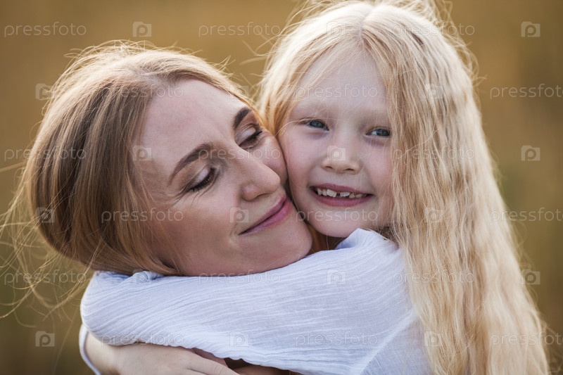 Красивая молодая мать и ее дочь на пшеничном поле