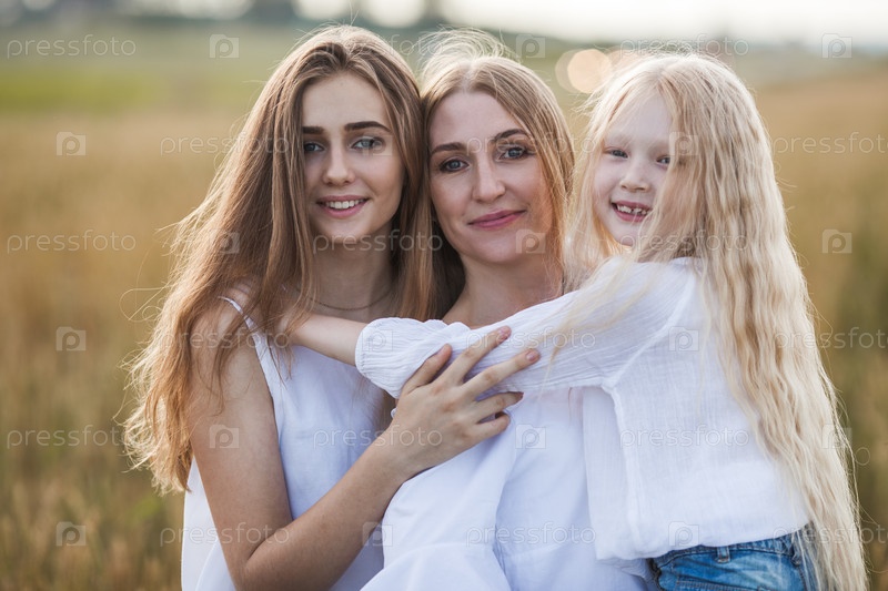 Красивая молодая мать и ее дочери в пшеничном поле