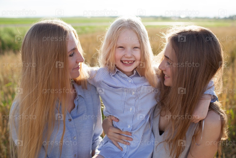 Красивая молодая мать и ее дочери в пшеничном поле