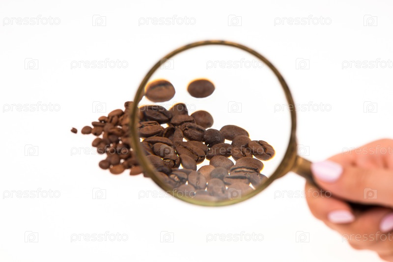 Девушка смотрит на кофейные зерна через лупу