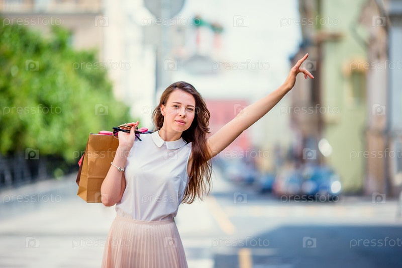 Молодая счастливая девушка ловит такси