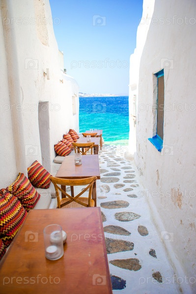 Скамейки с подушками в типичном греческом баре