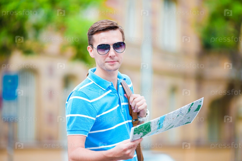 Молодой человек с картой города достопримечательностей