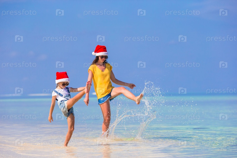 Маленькая девочка и молодая мать во время пляжного отдыха