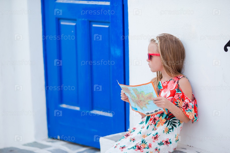Очаровательная девочка в белом платьена старых улицах Миконоса