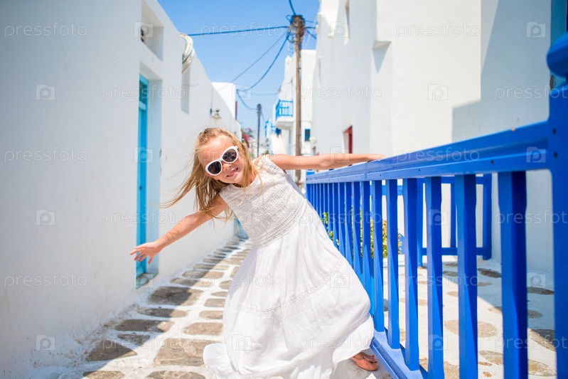 Очаровательная девочка в белом платье на старых улицах Миконоса