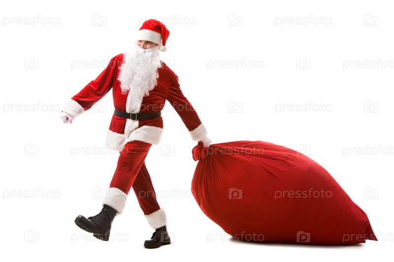 Портрет Санты-Клауса, несущего тяжелый мешок с подарками