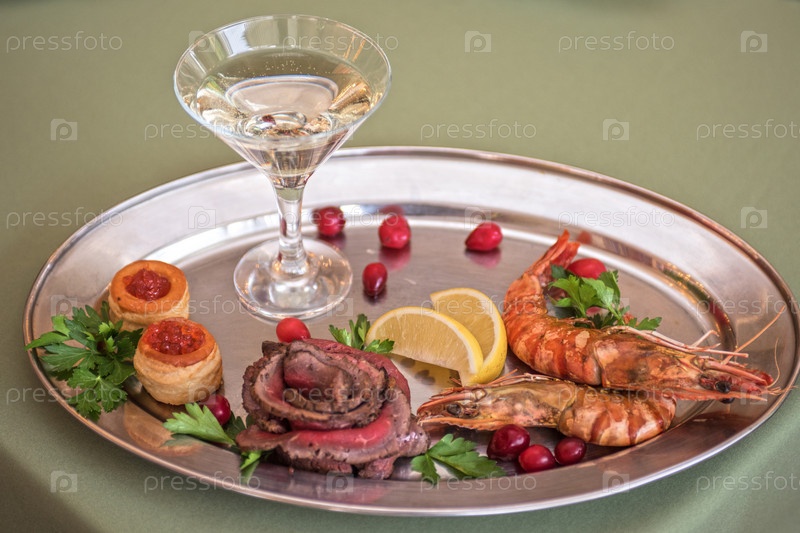 Жареные креветки и говядина