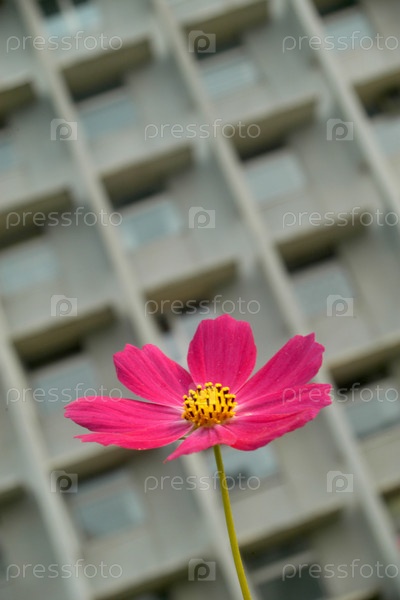 Розовый цветок на фоне многоэтажного дома