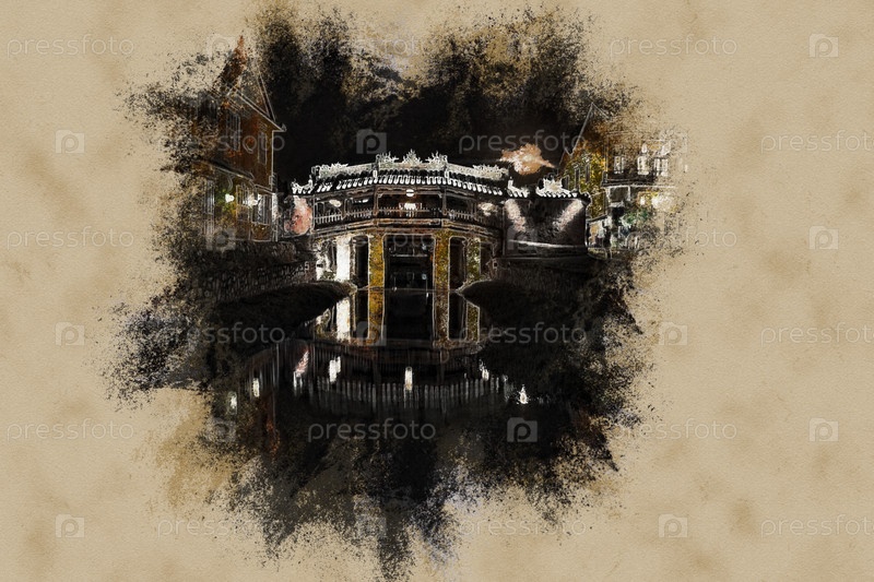 Старый японский мост ночью в Хойане