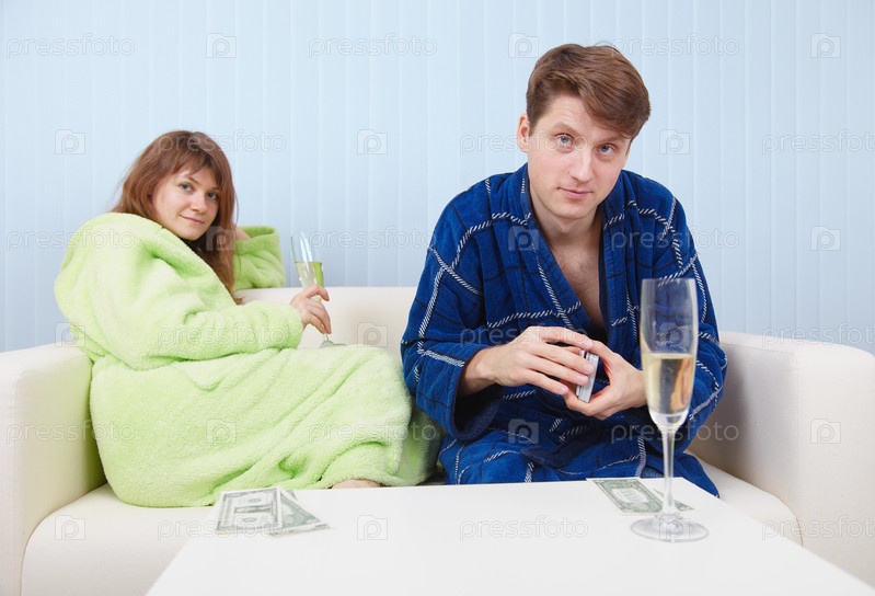Молодая пара играет в карты на деньги и пьёт шампанское