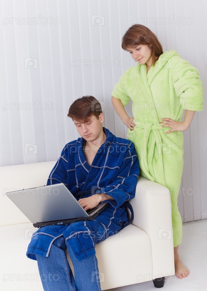 Молодая жена неудовлетворенно стоит за спиной мужа, который увлекается работой с ноутбуком в Интернете