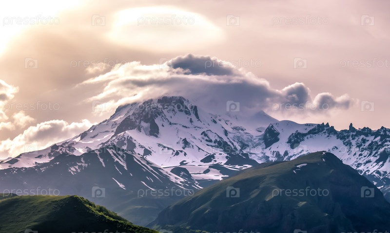 Снежный пик горы Казбек в вечернее время