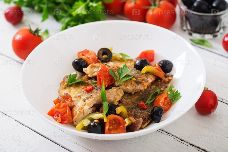 Жареное филе хека с помидорами и оливками
