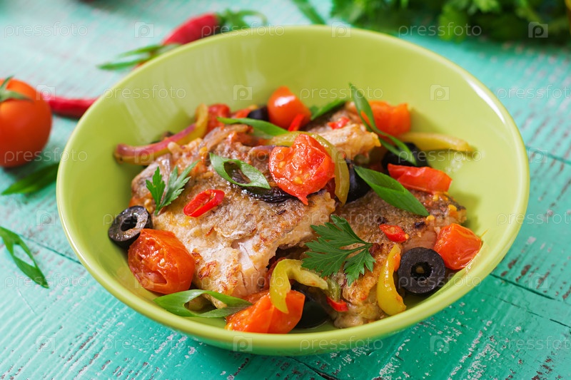 Жареное филе хека с помидорами и оливками