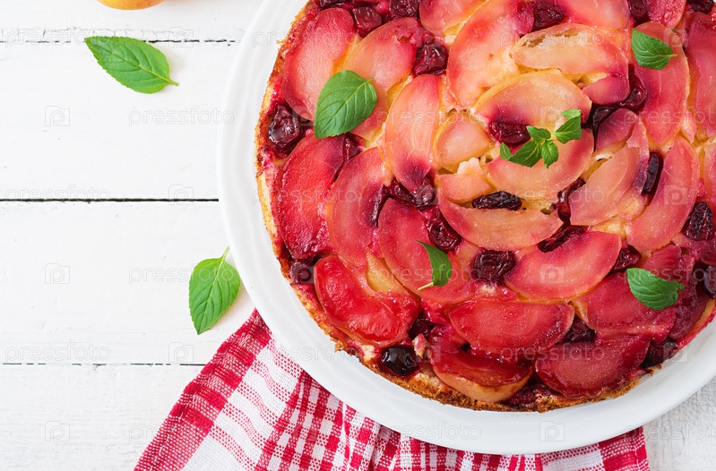 Нежный бисквитный торт с яблоками и вишней