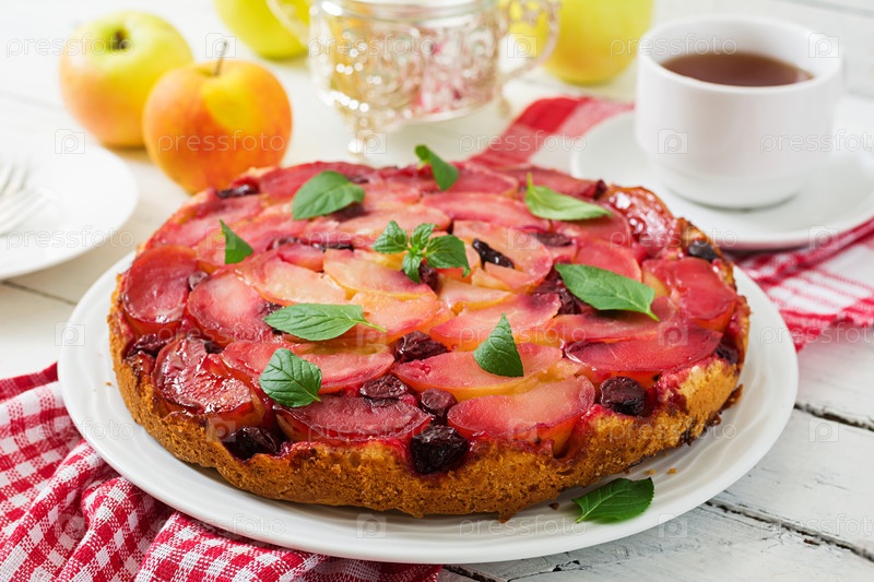 Нежный бисквитный торт с яблоками и вишней