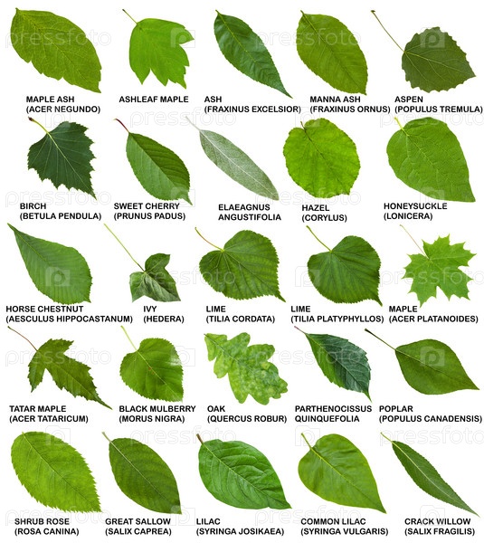 Зеленые листья деревьев и кустарников с названиями