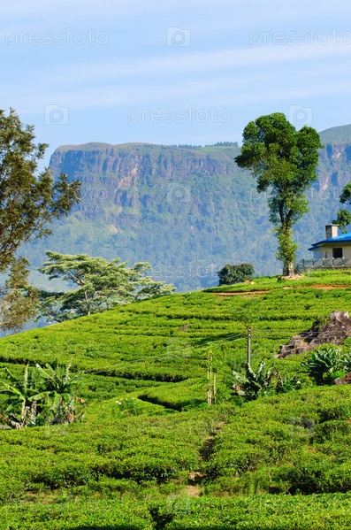 Зеленые чайные поля на холмах с домом и горами на заднем плане