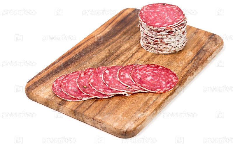 Ломтики салями на деревянной доске