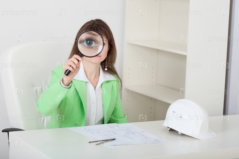 Забавная девушка смотрит на нас через большую лупу