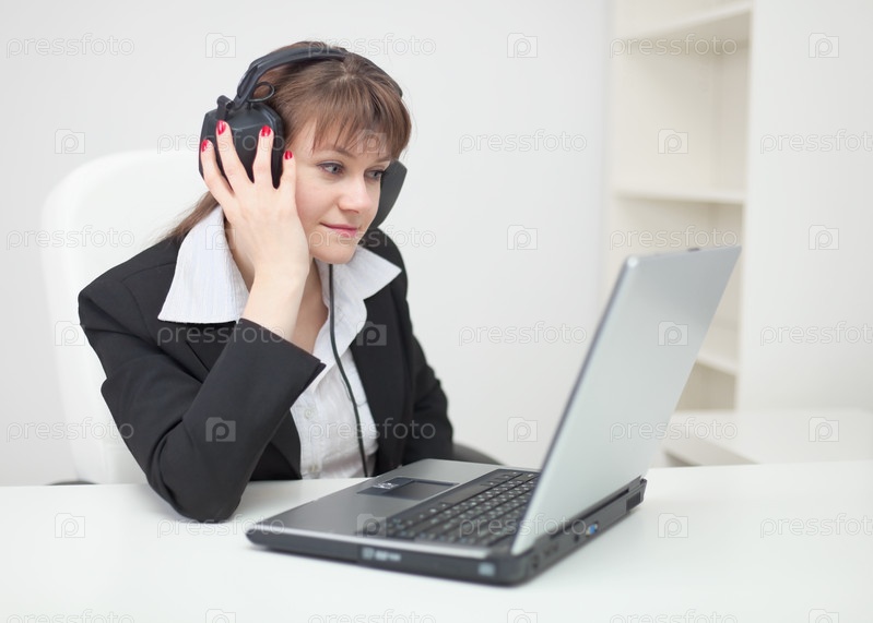 Молодая женщина с наушниками на голове сидит перед ноутбуком в офисе