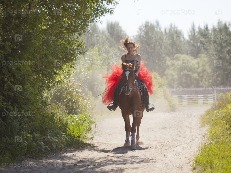 Девушка в красной юбке едет на лошади, школа конного спорта