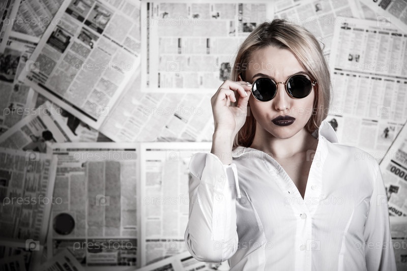 Красивая блондинка на фоне газет