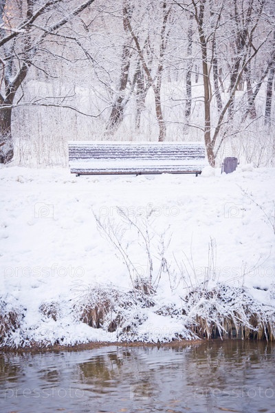 Скамейка на заснеженных берегах реки