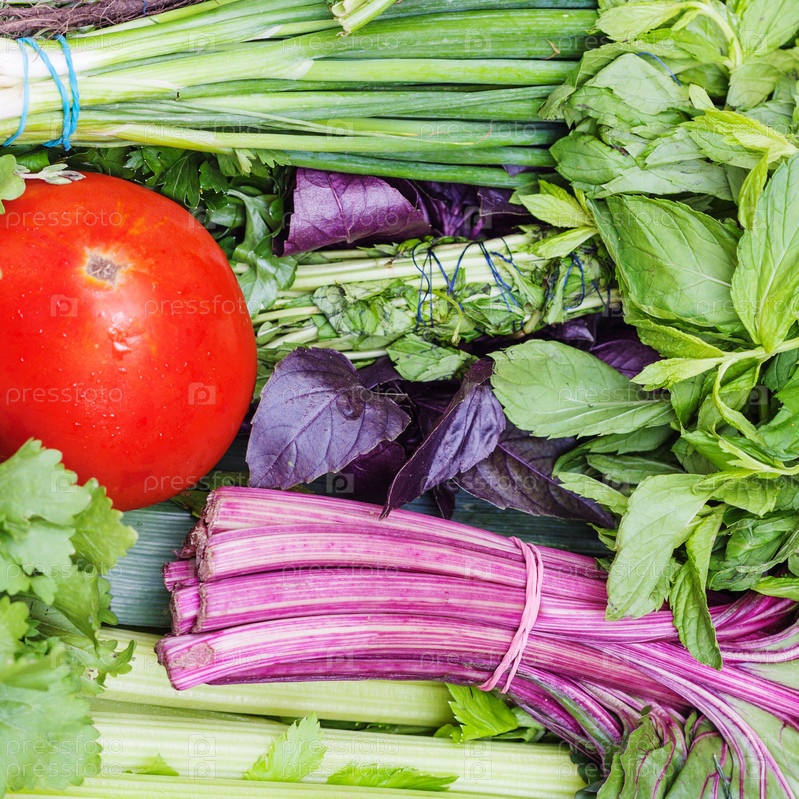 Свежая зелень и красный помидор