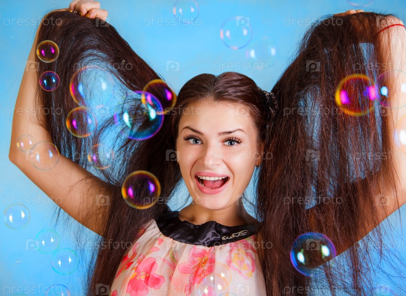 Молодая женщина с мыльными пузырями