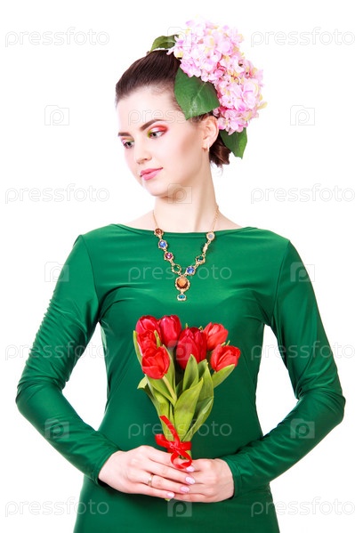 Красивая молодая женщина в зеленом вечернем платье