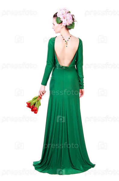 Красивая молодая женщина в зеленом платье