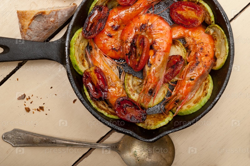 Жареные креветки с кабачками и помидорами