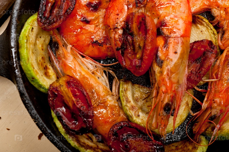 Жареные креветки с кабачками и помидорами