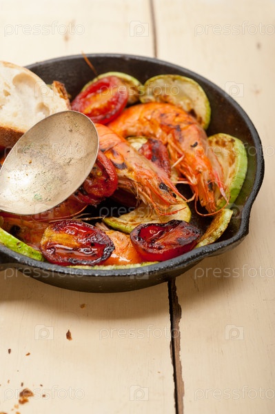 Жареные креветки с кабачками и помидорами