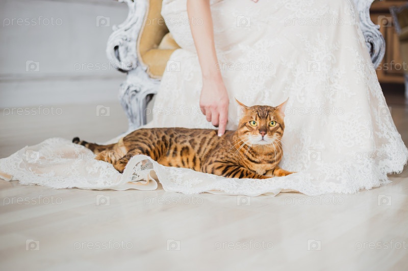 Бенгальская кошка сидит возле невесты