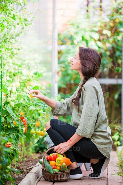 Молодая женщина собирает овощи