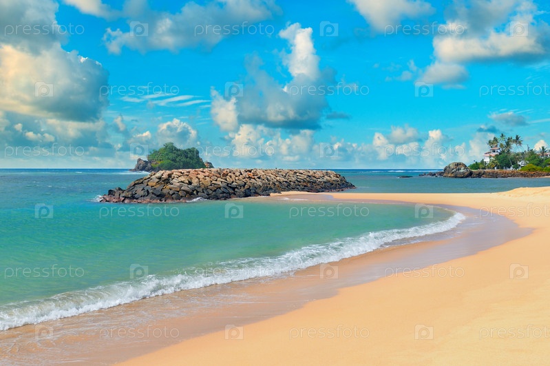 Океан, песчаный пляж и голубое небо
