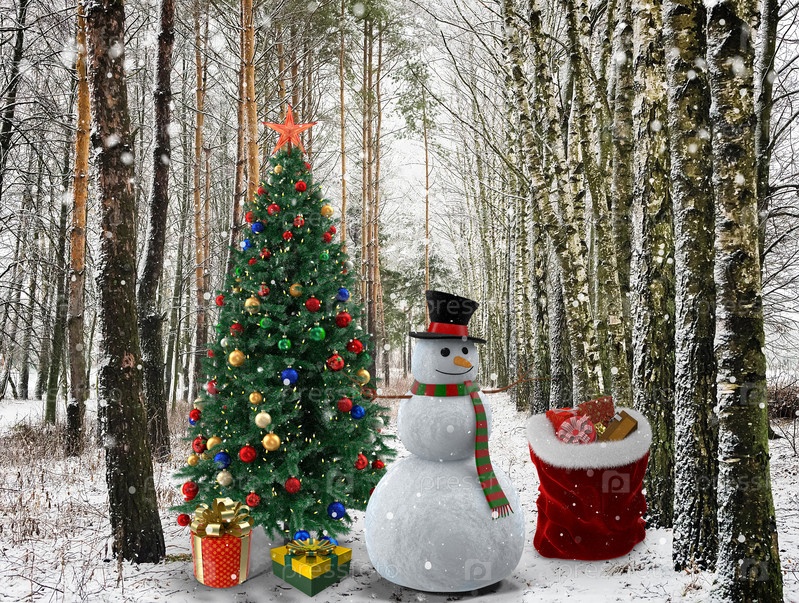 Снеговик в лесу у новогодней елки