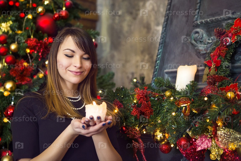 Привлекательная брюнетка у рождественской елки