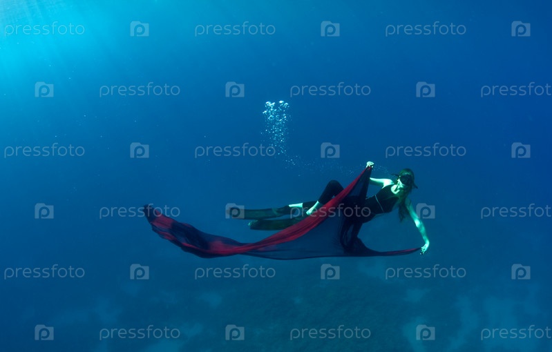 Девушка - дайвер под водой с рыбой