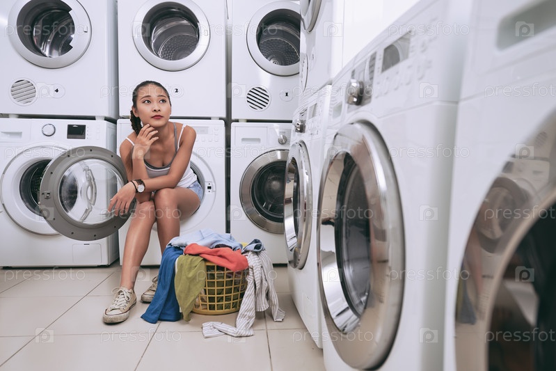 Мечтательная девушка в прачечной