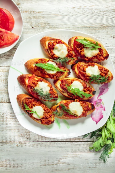 Тосты с мясным фаршем, соусом и сыром