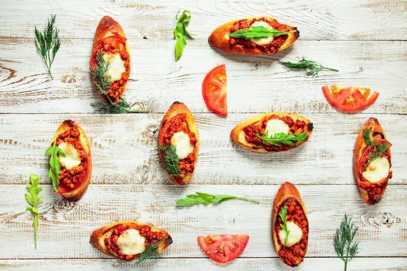 Тосты с мясным фаршем, соусом и сыром