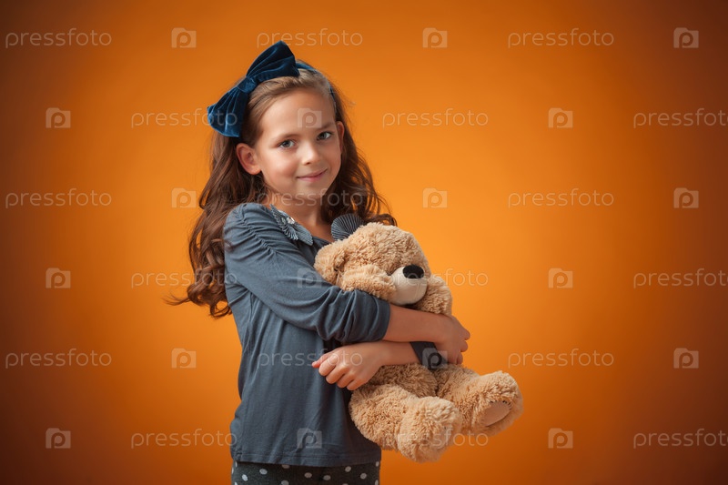 Милая веселая девочка на оранжевом фоне