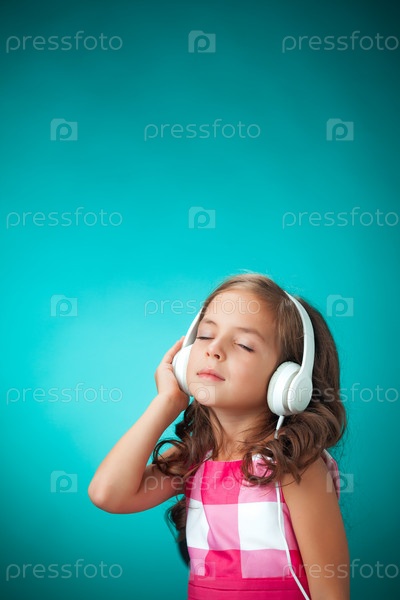 Милая веселая девочка слушает музыку