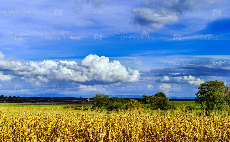 Поле и голубое небо с пышными облаками