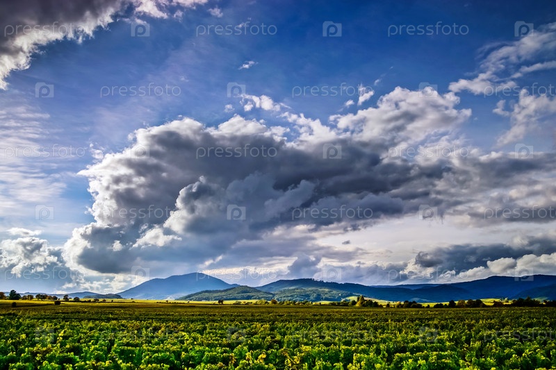 Поле и голубое небо с пышными облаками