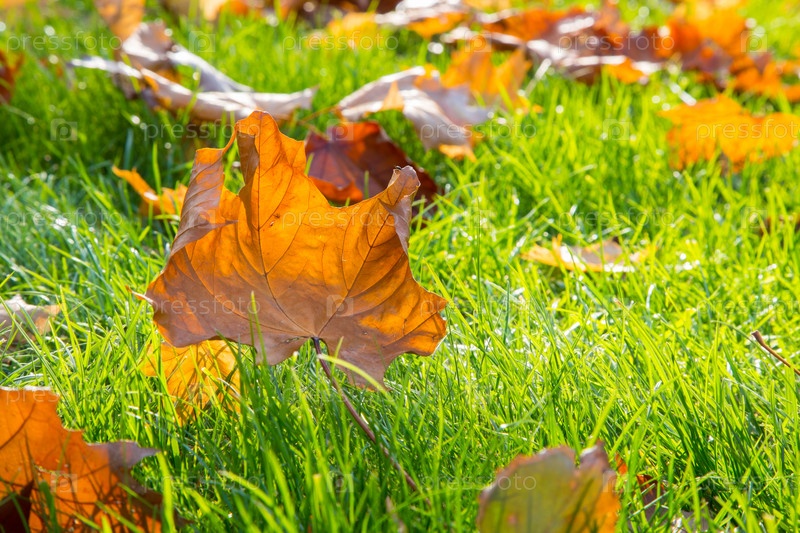 Осенние листья на зеленой траве